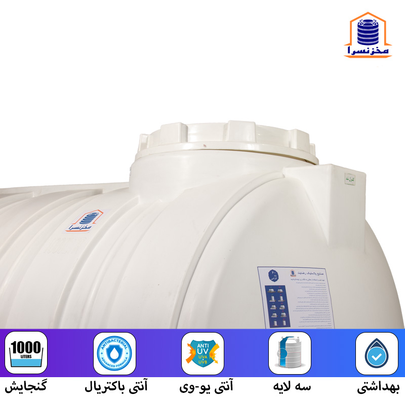 مخزن 1000 لیتری افقی از پرفروشترین مخزنهای کارخانه صنایع پلاستیک رضایت است با توجه به توصیه سازمان آب و فاضلاب کشور به طور متوسط برای هر واحد مسکونی در طول ۲۴ ساعت میبایست ۲۵۰ لیتر آب جهت ذخیره سازی در نظر گرفت پس میتوان گفت مخزن ۱۰۰۰ لیتری افقی یکی از مناسبترین گزینهها برای ساختمانهای ۴ واحدی است این محصول از مواد درجه یک پلی اتیلنی ساخته میشود و در انواع تک لایه سه لایه و چهار لایه آنتی باکتریال تولید میشود مخزن ۱۰۰۰ لیتری افقی سه لایه و چهار لایه به خاطر داشتن یک لایه ضد یووی میتواند زیر نور مستقیم قرار گیرد